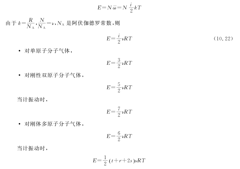 从微观观点来看,系统的内能是系统中所有分子的能量的总和,它包括系统内所有分子的热运动的动能、分子内原子的振动动能、分子间的相互作用势能以及原子内电子的能量和核内能量。在通常温度下,原子内部的能量是不变的,故在计算内能的改变时可不用考虑。对于理想气体,忽略了分子间的相互作用,所以只需计算分子本身各种运动(平动、转动和振动)的能量。设一定理想气体的分子总数是N,根据能量均分定理,由式(10.21)可求出ν摩尔理想气体的内能为