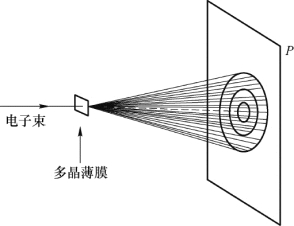 1927年,戴维孙和革末做了电子束在晶体表面上散射的实验,观察到了和X射线衍射类似的电子衍射现象,首先证实了电子的波动性。同年,汤姆孙做了电子束穿过多晶薄膜的衍射实验(图12.8),成功地得到了和X射线通过多晶薄膜后产生的衍射图样极为相似的衍射图样(图12.9)。1961年,约恩孙做了电子的单缝、双缝、三缝等衍射实验,得出的明暗条纹更加直接地证实了电子具有波动性。