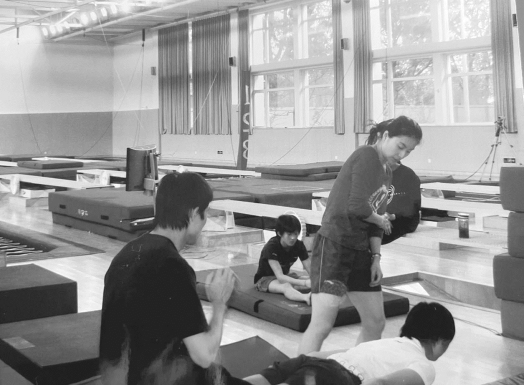 过了一会儿,她站在垫子前,无力地趴在那里,马尾辫向右边疲倦地耷拉着。过去我总是看到她在跳台上风光无限,在广告中神采飞扬。生活中的郭晶晶比屏幕上要显得瘦小,她的双脚踝关节和右脚脚板都缠着厚厚的纱布。看到她汗水涔涔的背影,我的心不由得一阵战栗。