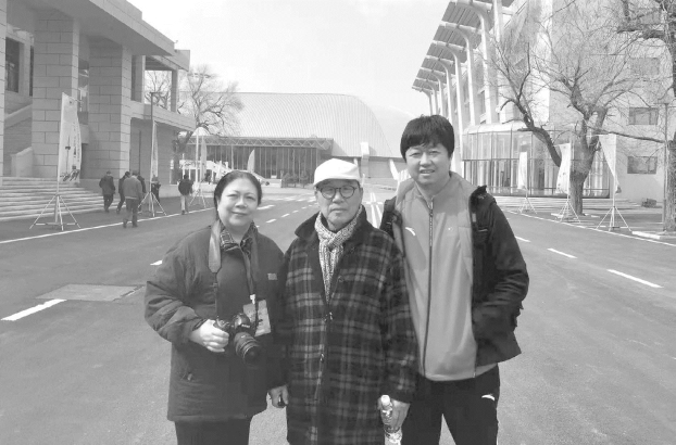作者采访中国首枚冰雪运动奖牌获得者罗致焕(中)