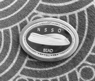 郑方还送给我一枚徽章,黄色的椭圆形外围,中间是黑色的底盘,上面有黄色的“冰丝带”造型。“冰丝带”上面有NSSO四个黄色的英文字母,是Nations Speed Skating Oval的英文字头,即国家速滑馆的英文缩写。徽章的椭圆形是缩小的场馆屋顶俯视图,缩小1万倍。外环渐变的小点点代表屋顶上安装的太阳能发电系统,徽章中间的图案是22条“冰丝带”线条的立体图。