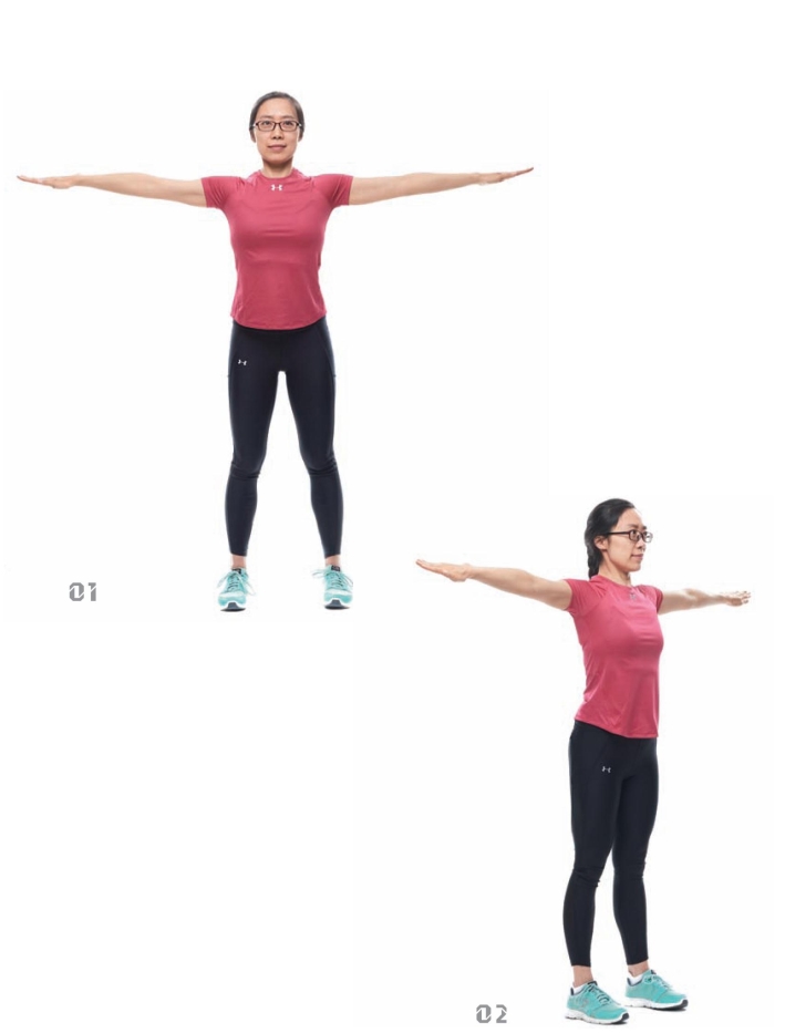起始姿态:两脚与髋同宽,脚尖向前,收腹挺胸,保持身体正直。双手五指并拢,两臂伸直,向身体两侧抬平,并保持在一条直线上。大臂微内旋,掌心朝向后下方。