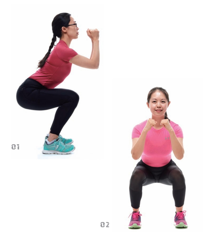 动作轨迹:先屈髋,再屈膝,下蹲过程中大腿与脚掌同方向。双手握拳,抱于胸前。动作全程腰背收紧挺直,重心偏脚跟靠后,主动伸展臀部及大腿后侧。下蹲到大腿与地面平行。