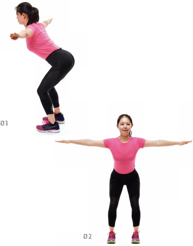 起始姿态:两脚与髋同宽,脚尖向前。微屈膝,屈髋。膝关节与脚尖同方向。躯干挺直并前倾至45°,重心微向前。沉肩挺胸,双手五指并拢,两臂向身体两侧抬平,并伸直保持在一条直线上。掌心方向微向后下。
