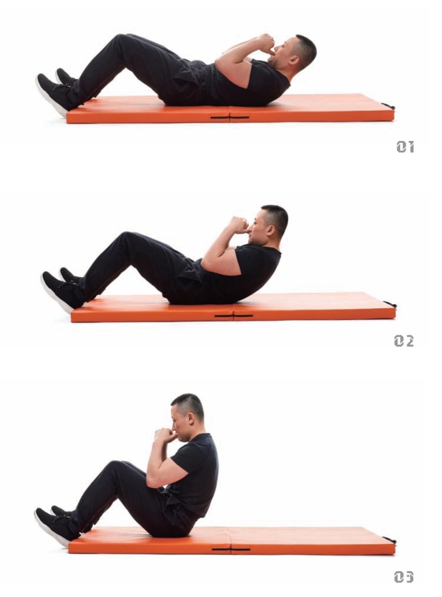 这是大家再熟悉不过的动作,中小学体育课都会考仰卧起坐。但是按住脚的仰卧起坐,腿部和腰髂肌会借力过多,影响腹部受力。所以我们要求不按脚,用腹肌卷曲的力量起来。