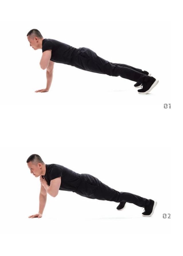 起始姿态:身体俯卧于垫上,掌心向下,手掌撑于地面。两手与肩同宽,手臂相互平行,并垂直于地面。挺胸收腹,微抬头;收臀,髋部保持中立位。两脚大于等于肩宽,双腿伸直,勾脚尖,将身体撑起。