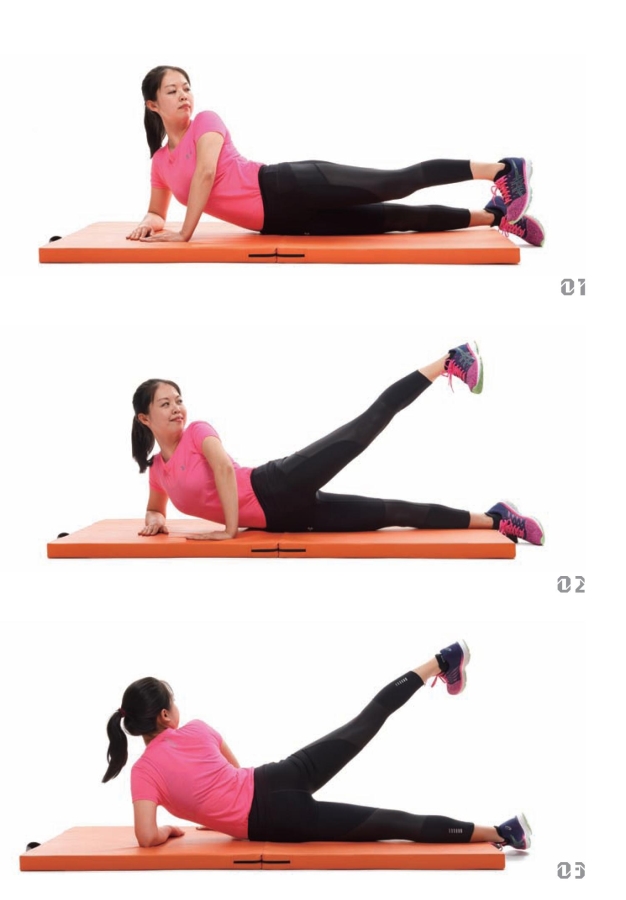 起始姿态:身体正直,侧身俯卧于垫上。下面一侧的腿伸直向后打开一些。上面一侧的腿伸直勾脚尖,髋部内旋,脚尖向下。下面一侧手臂,大臂垂直于地面,屈肘90°,掌心向下,将上身撑起稳定。上面一侧手臂,手掌撑于胸前,稳定躯干,保持向前侧身45°的姿态。