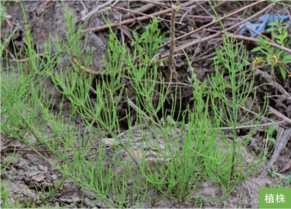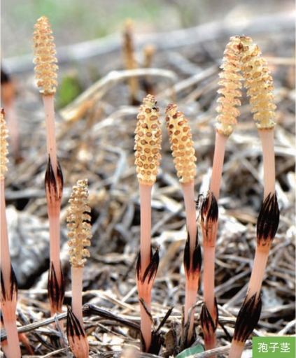 形态特征:多年生草本,高5~35厘米。根茎横走,黑棕色。地上茎一年生,直立,二型。孢子茎春季先萌发,高5~20厘米,黄棕色,无分枝;鞘筒栗棕色或淡黄色,鞘齿栗棕色。营养茎在孢子茎枯萎时或枯萎后萌发,高达40厘米,节间绿色,节部轮生分枝,鞘筒狭长、绿色,鞘齿黑褐色,边缘膜质,宿存。侧枝柔软纤细,不再分枝。孢子囊穗顶生,圆柱形,顶端钝。孢子成熟期5月。
