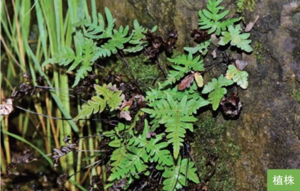 形态特征:多年生草本,高15~30厘米。根状茎直立或斜升。叶簇生;叶柄栗褐色,有光泽,基部疏被棕色披针形鳞片;叶片五角形,长和宽近相等,2.5~7厘米;羽片3~5对,基部三回羽裂,中部二回羽裂,上部一回羽裂;基部1对羽片最大;叶厚纸质,表面暗绿色,背面被乳白色或淡黄色粉末。孢子囊群顶生于小脉,成熟后汇合成线形,沿叶边缘连续排列;囊群盖连续,黄绿色。孢子极面观为钝三角形,周壁表面具颗粒状纹饰。孢子成熟期7—9月。