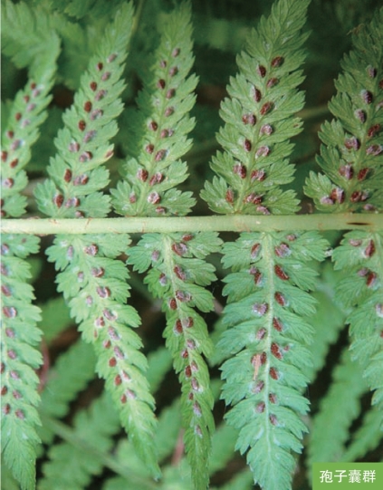 形态特征:多年生草本,高35~50厘米。根状茎短,直立或斜升。叶簇生;能育叶长35~120厘米;叶柄基部黑褐色,膨大成腹凹背凸的狭纺锤形,向下明显尖削,密生深褐色鳞片;叶片卵形至卵状披针形,长20~65厘米,中部宽20~35厘米,三回羽状;羽片15~18对,基部1~2对羽片常略缩短;小羽片18~28对,基部略与羽轴合生。孢子囊群长圆形、弯钩形或马蹄形,生于基部上侧小脉,每裂片1枚,在基部较大裂片上往往有2~3对;囊群盖与孢子囊群同形,边缘啮蚀状,宿存。孢子周壁表面有颗粒状纹饰。孢子成熟期7—8月。