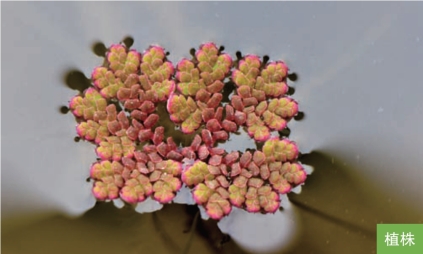 形态特征:一年生小型漂浮植物。根状茎细长,横走。侧枝腋生,假二歧分枝,向下生须根。叶互生;叶片小,长约1毫米,覆瓦状排列成两行,叶片深裂分为背裂片和腹裂片两部分,背裂片长圆形或卵形,肉质,绿色,但在秋后常变为紫红色,表面有乳头突,背面有空腔;腹裂片贝壳状,无色透明,斜沉水中。孢子果双生于分枝处,大孢子果体积小,长卵形,内藏一个大孢子囊,大孢子囊只产一个大孢子;小孢子果体积较大,圆球形或桃形,内含多数具长柄的小孢子囊,每个小孢子囊内有64个小孢子。孢子成熟期9—10月。