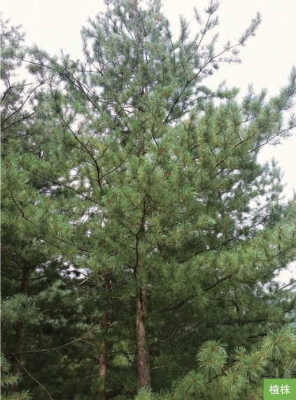 形态特征:常绿乔木,高达50米。幼树树皮灰褐色,近平滑;大树树皮带红褐色,鳞块状不规则纵列,脱落痕为红褐色。枝近平展,树冠圆锥形。一年生枝密被黄褐色或红褐色柔毛。针叶5针一束,长6~12厘米,粗硬,直,深绿色。雄球花椭圆状圆柱形,红黄色,密集于新枝下部成穗状;雌球花绿褐色,圆柱状卵圆形,直立,单生或数个集生于新枝近顶端。球果卵圆形或柱状长圆形,长8~15厘米,直径6~8厘米。种子大,暗紫褐色或褐色,倒卵状三角形,微扁。花期6月,球果第二年9—10月成熟。