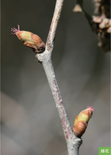 形态特征:落叶灌木或小乔木,高1~3米。树皮灰褐色或暗褐色。当年生枝黄褐色,具锈褐色密毛,老枝无毛。叶互生;叶片宽椭圆形、宽卵形或近圆形,长4~13厘米,宽2.5~10厘米,顶端凹缺或截形,基部心形,中央具三角状突尖。花单性,同株,先于叶开放;雄花序单生,长约4厘米;雌花序无柄,生于枝顶或雄花序下方。果单生或2~6枚簇生成头状。坚果近球形,长7~20毫米,淡棕褐色。果苞钟状,具脉纹,密被腺毛和刺毛。花期4—5月,果期8—10月。