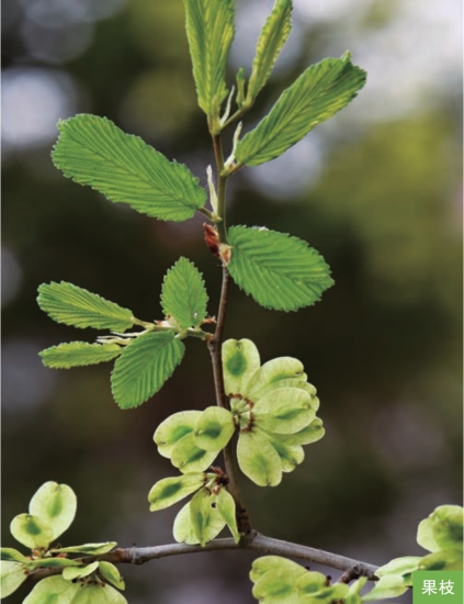 形态特征:落叶乔木,高可达30米。树皮暗灰色或灰白色,表层剥落。小枝褐色,密生灰白色短柔毛。叶互生;叶片倒卵状椭圆形或宽倒卵形,长4~12厘米,宽3~7.5厘米,表面粗糙,有稀疏短硬毛或无毛,背面被短柔毛。花簇生于上年生枝上。翅果倒卵形,长12~14毫米,宽8~10毫米,顶端圆形,微凹,果核部分无毛。种子位于中上部,与缺口相连。花果期4—5月。