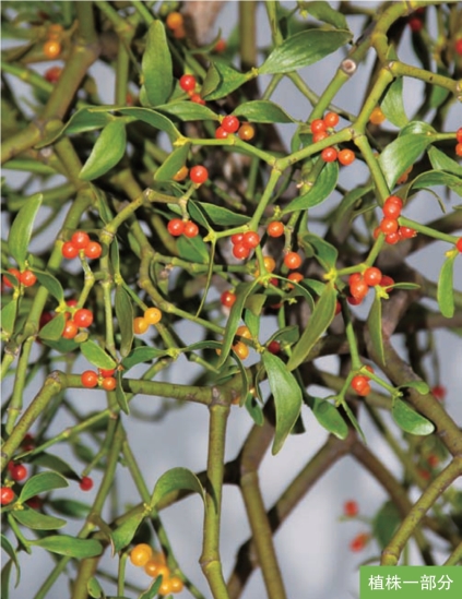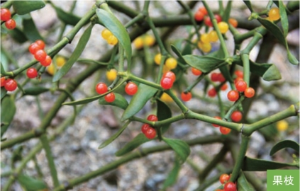 形态特征:常绿小灌木,高30~80厘米。茎、枝均圆柱状,2~3叉状分枝。叶对生于枝端,稀3枚轮生;叶片长圆形或倒披针形,长3~7厘米,宽0.7~1.5厘米,顶端圆钝,基部楔形。花单性,雌、雄异株;花序顶生或腋生于茎叉状分枝处,雄花序聚伞状,3~5朵簇生;雌花序聚伞式穗状,具花3~5朵;雄花萼片4枚,卵形;雌花萼片4枚,三角形。浆果成熟时淡黄色或橙红色,球形,直径6~8毫米。花期4—5月,果期9—11月。