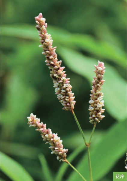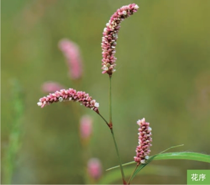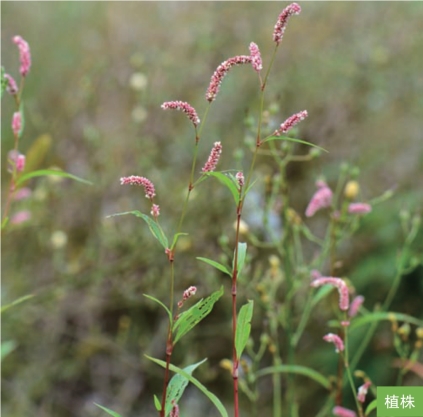 形态特征:一年生草本,高20~120厘米。茎直立,节部膨大。叶互生;叶片披针形或宽披针形,长5~15厘米,宽1~3厘米,顶端渐尖,基部楔形,表面绿色,常有新月形黑斑。圆锥花序由数个总状花序穗构成,顶生或腋生,花紧密;花被粉红色或淡绿色,常4裂。坚果黑褐色,卵圆形,扁平,长2~3毫米,有光泽,包于宿存花被内。花果期7—8月。