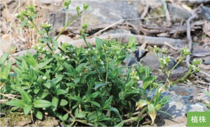 形态特征:多年生或一二年生草本,高10~30厘米。茎丛生,近直立,被白色短柔毛和腺毛。叶对生;基生叶叶片近匙形或倒卵状披针形,基部渐狭呈柄状,两面被短柔毛;茎生叶近无柄,叶片卵形、卵状长圆形或卵状披针形,长1~4厘米,宽3~13毫米,两面均被短柔毛。聚伞花序顶生;萼片5枚,外面密被长腺毛;花瓣5枚,白色,与萼近等长,顶端2浅裂。蒴果圆柱形,长约为宿存萼的2倍,顶端10齿裂。种子褐色,卵圆形,具瘤状突起。花期5—7月,果期6—8月。