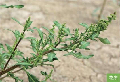 形态特征:一年生草本,高10~40厘米。茎平卧或外倾,具条棱及绿色或紫红色色条。叶互生;叶片长圆状卵形至披针形,长2~4厘米,宽6~20毫米,肥厚,边缘具缺刻状牙齿;中脉明显,黄绿色。花两性兼有雌性,通常数花聚成团伞花序,再于分枝上排列成有间断的穗状或圆锥状花序;花被裂片3~4枚,浅绿色。胞果顶端露出于花被外,果皮膜质,黄白色。种子暗褐色或红褐色,扁球形,直径约0.7毫米,表面有细点纹。花期6—9月,果期8—10月。