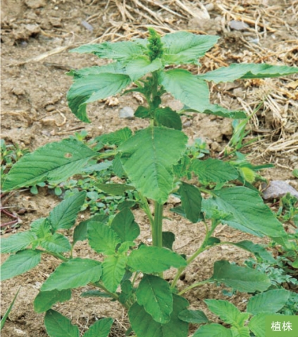 形态特征:一年生草本,高达1.5米。茎直立,粗壮,淡绿色,有时具带紫色条纹,密生短柔毛。叶互生;叶片菱状卵形或椭圆状卵形,长5~12厘米,宽2~7厘米,顶端锐尖或尖凹,基部楔形。花杂性,圆锥花序顶生及腋生,由多数穗状花序形成;花被片5枚,薄膜质,白色。胞果扁圆卵形,长约1.5毫米,环状横裂。种子棕色或黑色,近球形,直径约1毫米。花期7—8月,果期8—9月。