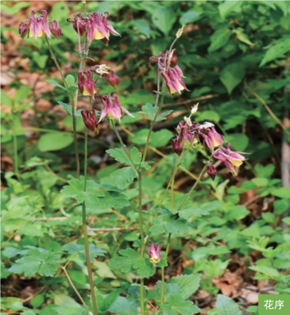 形态特征:多年生草本,高40~90厘米。茎直立,上部多分枝。茎生叶互生;基生叶为二回三出复叶,小叶倒卵形,长2~6厘米,宽2~5厘米,3浅裂或深裂;茎生叶具短柄,向上渐变小。花3~5朵构成聚伞花序;花较大而美丽,微下垂;萼片紫色,稍开展;花瓣瓣片黄白色,距长1.5~2厘米,末端强烈内弯呈钩状。蓇葖果长2.5~3厘米,花柱宿存。种子黑色,狭卵形,长约2毫米。花期5—6月,果期7—8月。
