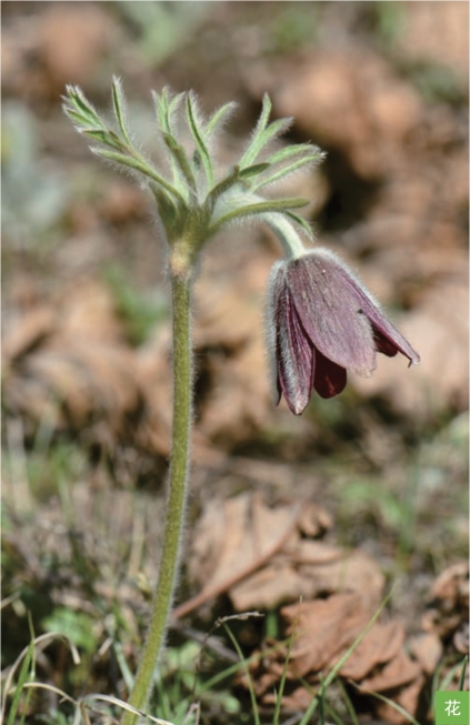 形态特征:多年生草本,高10~30厘米。根状茎长达15厘米。基生叶4~6枚,有长柄;叶片卵形,长3~8厘米,宽4~6厘米,基部浅心形,三出羽状分裂,顶裂片有柄,3全裂,裂片再2~3深裂,背面及边缘密被柔毛。单花顶生;总苞近钟形,掌状深裂;萼片6枚,紫红色,外面密被柔毛。聚合果近球形,直径5~8厘米;瘦果倒卵状长圆形,长约3毫米,有短柔毛,宿存花柱长2~4厘米,有开展的长柔毛。花期4—5月,果期5—6月。