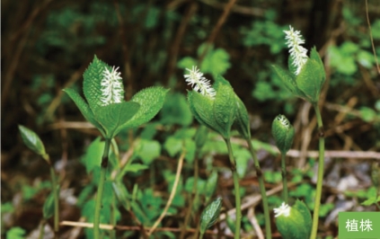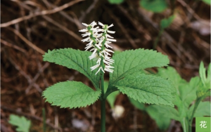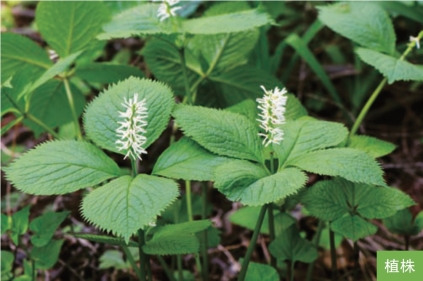 形态特征:多年生草本,高20~50厘米。根状茎多节,横走。茎直立,单生或数个丛生,节上对生2片鳞状叶。叶对生,通常4片生于茎顶,成假轮生;叶片宽椭圆形或倒卵形,长7~14厘米,宽5~8厘米。穗状花序单一,顶生;花白色;苞片三角形或近半圆形;雄蕊3枚,药隔基部连合,药隔延伸成线形,长约5毫米。核果成熟时褐色,近球形或倒卵形,长2.5~3毫米,具长1~1.5毫米的柄。花期4—5月,果期6—7月。