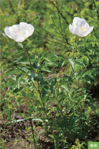 形态特征:多年生草本,高40~70厘米。根粗壮,红褐色。叶互生,一至二回三出复叶或上部叶为单叶;小叶狭卵形、椭圆形或披针形,长7~13厘米,宽2~7厘米,边缘具白色骨质细齿。花大型,一至数朵生于茎顶和叶腋;苞片4~5枚,叶状;萼片3~5枚;花瓣8~13枚,白色或粉红色。蓇葖果卵形或椭圆形,长1.5~3厘米,顶端具喙。花期5—6月,果期7—8月。