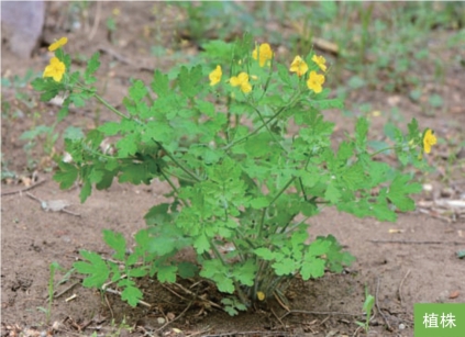 形态特征:多年生草本,高30~100厘米,含橘黄色乳液。主根粗壮,圆锥形。茎直立,多分枝。叶互生,一至二回奇数羽状分裂;基生叶长10~15厘米,裂片5~8对,早凋落;茎生叶叶片长5~10厘米,宽1~5厘米,裂片2~4对,表面绿色,背面绿白色。花数朵排列成伞形聚伞花序;萼片2枚,卵圆形,舟状;花瓣4枚,黄色。蒴果灰绿色,长角形,长2~5厘米,粗2~3毫米,直立,成熟时由下向上2瓣裂。种子暗褐色,卵形,长约1毫米或更小。花期5—8月,果期6—9月。