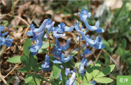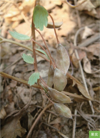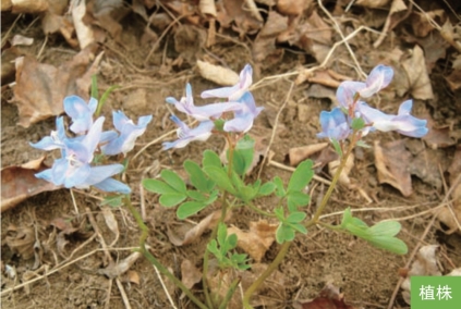 形态特征:多年生草本,高8~20厘米。块茎球形。茎细长,基部以上具1枚鳞片。叶为二回三出复叶,小叶倒卵形或椭圆形,长6~25毫米,宽5~20毫米。总状花序具1~14朵花;花浅蓝色、蓝紫色或紫红色;花冠唇形,4瓣,2轮。蒴果卵形或长卵形,长8~15毫米,具4~6粒种子,2列。种子黑色,扁肾圆形,直径约1.5毫米,光滑,具白色鳞片状种阜。花期4月,果期5月。