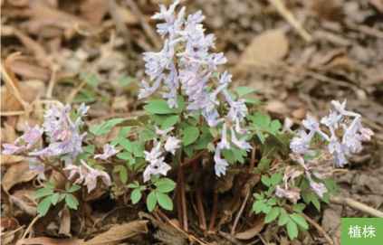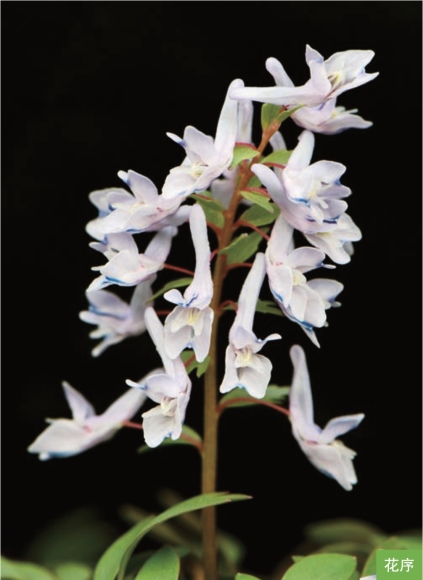 形态特征:多年生草本,高7~20厘米。块茎球形。茎细长,基部以上具1枚鳞片。叶为二回三出复叶,小叶倒卵形或椭圆形,长5~25毫米,宽3~15毫米。总状花序具1~20余朵花;花蓝白色或白色;花冠唇形,4瓣,2轮,内花瓣顶端角状。蒴果长卵形,长8~15毫米。种子黑色,扁肾圆形,直径约1.5毫米,光滑,具白色鳞片状种阜。花期4月,果期5月。