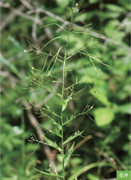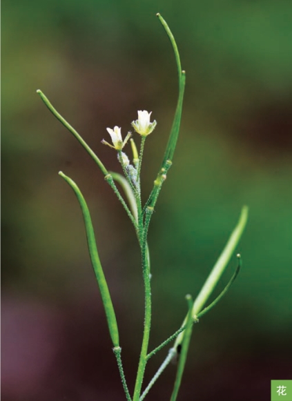形态特征:多年生草本,高30~150厘米,全株被星状毛及硬单毛。茎直立,上部有分枝。基生叶有柄,茎生叶互生,无柄;茎生叶长椭圆形至倒卵形,长3~15厘米,宽1.5~5厘米,顶端渐尖,基部延伸成耳,半抱茎,边缘有浅锯齿。总状花序顶生或腋生;萼片背面被有单毛及星状毛;花瓣白色、匙形。长角果线形,长4~10厘米,宽1~2毫米,弧曲,下垂。种子椭圆形,褐色,长1.5~2毫米,边缘有环状的翅。花期6—7月,果期8—9月。