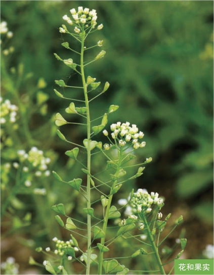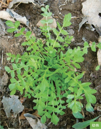 形态特征:一年或二年生草本,高10~50厘米。茎直立,单一或从下部分枝。基生叶呈莲座状,叶片长圆形,羽状深裂、大头羽状分裂、不整齐羽裂或全缘;茎生叶互生,长圆形或披针形,长1~3毫米,宽约5毫米,基部箭形,抱茎,边缘有缺刻或锯齿。总状花序顶生及腋生;萼片膜质;花瓣白色,倒卵形。短角果倒三角状心形,长5~8毫米,宽4~7毫米,扁平,顶端微凹。种子2行,棕色,长椭圆形,扁平,长约1毫米。花期5月,果期5—6月。
