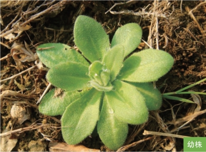 形态特征:一年或二年生草本,高10~45厘米。茎直立,下部密生单毛、叉状毛和星状毛。基生叶莲座状,长倒卵形,长1~2厘米,宽5~7毫米;茎生叶互生,无柄,向上渐小,卵形或椭圆形。总状花序密集成伞房状,顶生和腋生;花瓣黄色,花期后变成白色,顶端凹。短角果长圆形或长椭圆形,长4~10毫米,宽1.1~2.5毫米,被短单毛。种子红褐色,近圆形,种皮有小疣。花期4—5月,果期5月。