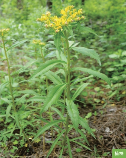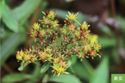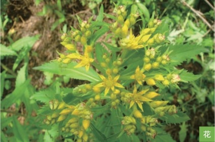 形态特征:多年生草本,高20~50厘米。根状茎粗短。茎直立,不分枝。叶互生;叶片椭圆状披针形至卵状倒披针形,长3.5~8厘米,宽1~2厘米,顶端渐尖,基部楔形,无柄。聚伞花序顶生;萼片5枚,绿色,肉质;花瓣5枚,黄色;鳞片5枚。蓇葖果呈星芒状排列,长约7毫米,有直喙。种子长圆形,长约1毫米。花期6—7月,果期8—9月。
