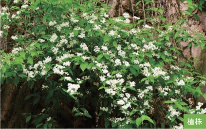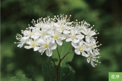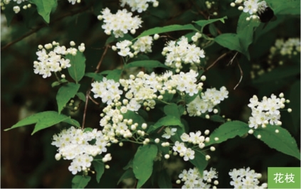 形态特征:落叶灌木,高2~3米。老枝灰褐色,剥裂;小枝红褐色。叶对生;叶片卵状长圆形、卵状披针形或近椭圆形,长4~11厘米,宽2~4厘米,表面疏被3~4辐线星状毛。伞房花序,有花5~20(30)朵;萼筒钟形,裂片5枚;花瓣5枚,白色;花丝钻形,基部宽扁。蒴果近球形,直径4~5毫米,花柱宿存。花期5—6月,果期8—9月。