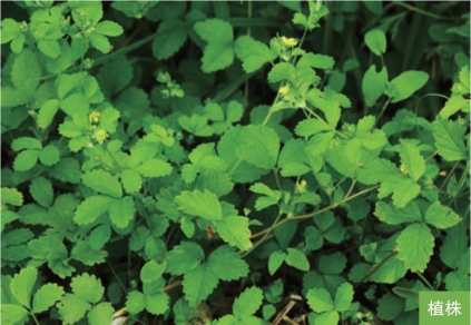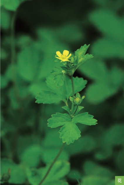 形态特征:多年生草本。根纤维状。茎细弱,半卧生或斜升,节处常生根,长30~50厘米。三出复叶;小叶宽倒卵形、卵形或近菱形,长1~2厘米,宽0.8~1.5厘米,顶端圆形,基部楔形或歪楔形,边缘有齿,表面绿色,背面淡绿色。单花腋生,花直径7~8毫米;萼片长圆状卵形,副萼片比萼片短;花瓣黄色,短于萼片。瘦果倒卵形,长1毫米。花期6—7月,果期7—8月。