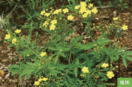 形态特征:多年生草本,高20~60厘米。根粗壮,近木质。花茎直立,密被灰白色绵毛。奇数羽状复叶;基生叶有小叶5~15对,小叶片对生或互生,狭长圆形,长1~5厘米,宽0.5~1.5厘米,边缘羽状中裂;茎生叶互生,较小,小叶5~7对。伞房状聚伞花序;萼片三角状卵形,副萼片比萼片短;花瓣黄色,顶端微凹。瘦果深褐色,卵圆形,长1.5~2毫米,直径1~1.5毫米,微皱。花期5—6月,果期7—9月。