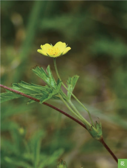 形态特征:多年生草本。根纤细。茎匍匐,有时为紫红色或暗红色,被伏毛。掌状复叶;小叶3~5枚,披针形或长圆状披针形,长2~3厘米,宽1~1.5厘米,顶端尖,基部狭楔形,边缘有缺刻状锯齿。单花腋生,直径约1厘米;萼片三角状钻形,副萼片与萼片近等长;花瓣黄色。瘦果长圆状卵形,长约0.5毫米。花期6—7月,果期7—8月。