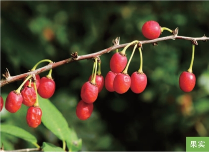 形态特征:落叶灌木,高1~3米。茎直立或拱形,皮片状剥落,具片状髓。枝刺生于叶腋,微弯。单叶互生;叶片长圆状披针形或长圆状卵形,长3~8厘米,宽1~3厘米,全缘,偶有稀疏细锯齿。花1~4朵簇生于叶腋;花直径1~1.5厘米;萼裂片5枚;花瓣5枚,黄色。核果艳红色或暗红色,近球形,直径1~1.5厘米,光滑无毛;果核坚硬,扁圆形,直径8~10毫米,有深沟纹。花期4—5月,果期8—9月。
