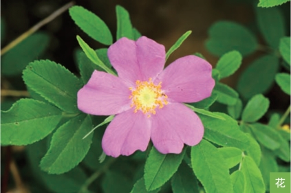 形态特征:落叶灌木,高1~2米。小枝光滑,褐紫色或黄褐色,具稀疏皮刺。叶互生;基数羽状复叶具小叶5~9枚,小叶片长椭圆形或长卵状椭圆形,长1.5~3.5厘米,宽5~15毫米。花单生或2~3朵簇生;花直径3~4厘米;萼片5枚,披针形,顶端长尾状尖;花瓣5枚,粉红色至深粉红色。蔷薇果红色,球形或卵球形,直径1~1.5厘米,光滑,萼片宿存,直立。花期6—7月,果期8—9月。