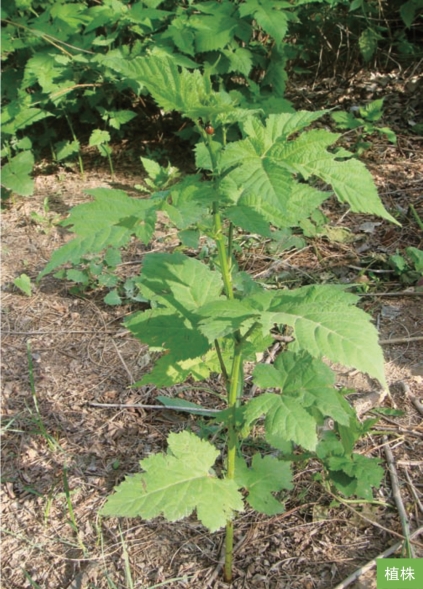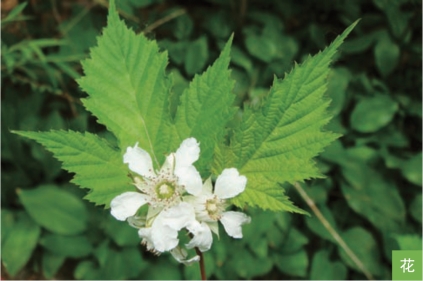 形态特征:落叶灌木,高1~2米。茎直立。小枝黄褐色至紫褐色,具皮刺。单叶互生;叶片宽卵形至近圆卵形,长5~12厘米,宽4~8厘米,边缘常为3~5掌状浅裂至中裂。花2~6朵簇生枝顶成短伞房状花序或1~2朵生于叶腋;花直径1~1.5厘米;萼裂片5枚,三角状卵形;花瓣5枚,白色。聚合果暗红色,近球形,直径约1厘米。花期6月,果期8—9月。