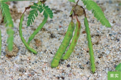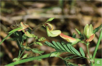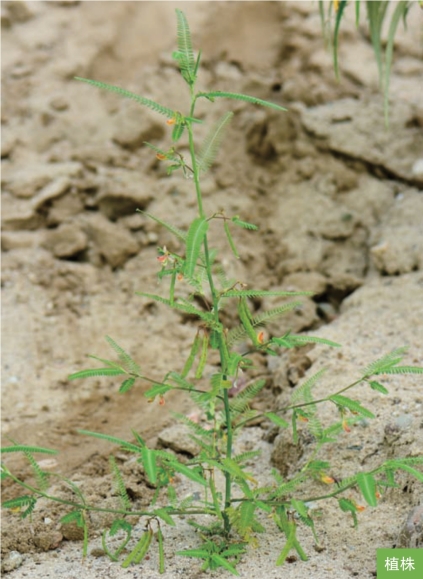 形态特征:一年生草本,高达0.8米。茎直立,中空。叶互生;偶数羽状复叶具小叶20~30对或更多,小叶片近无柄,线状长圆形,长5~9毫米,宽1.5~2.5毫米,全缘,表面密布腺点,背面稍带白粉。短总状花序腋生;萼2深裂,呈二唇形,下唇具3齿,上唇2齿;花冠黄色或稍带紫色。荚果为节荚,线状长圆形,长3~4厘米,宽约3毫米,表面常有乳头状突起,不开裂,熟时节与节分离。花期7—8月,果期8—9月。