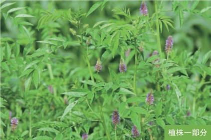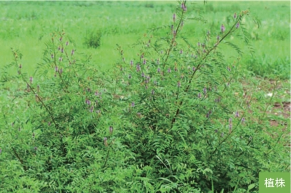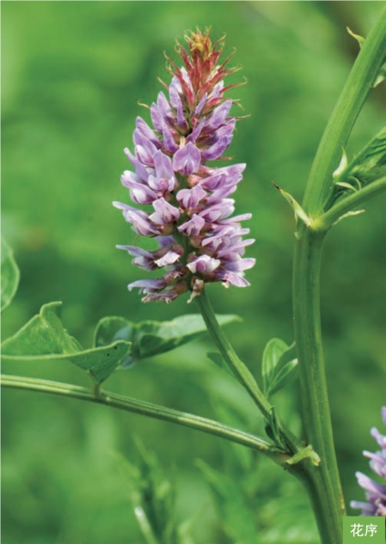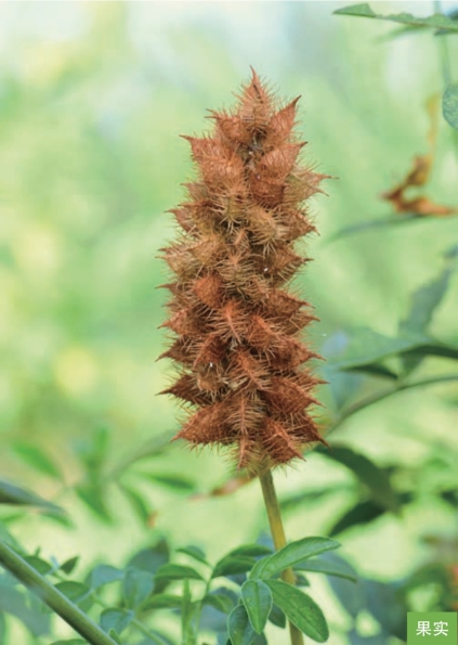 形态特征:多年生草本,高1~2米。茎直立,基部木质化。叶互生;奇数羽状复叶,叶长6~20厘米,具小叶9~15枚;小叶片披针形或卵状披针形,长2~4厘米,宽1~2厘米,全缘。总状花序腋生,花密集成长圆状;花萼钟状,萼齿5枚;花冠淡紫堇色、紫色。果序呈椭圆状。荚果黄褐色,卵圆形,长10~17毫米,宽6~8毫米,密被长3~5毫米的刺。种子黑色,圆肾形,长约2毫米。花期7—8月,果期8—10月。