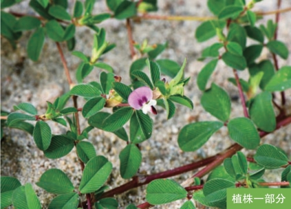 形态特征:一年生草本,高5~30厘米。茎平伏、斜升或直立,多分枝,茎和枝上被逆生的白毛。叶互生;三出羽状复叶,小叶片倒卵形、长倒卵形或长圆形,长6~22毫米,宽3~12毫米,顶端圆形,稀微缺,全缘。花常1~2朵腋生;花萼5裂;花冠淡红紫色。荚果近圆形或椭圆形,稍侧偏,长约3毫米,表面有网纹,并具细毛。花期7—8月,果期8—10月。