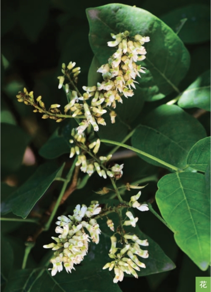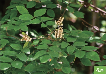 形态特征:落叶乔木,高可达15米。树皮幼时淡绿褐色,后呈暗灰色,薄片状剥裂。枝灰褐色,有褐色皮孔。叶互生;奇数羽状复叶,长16~20厘米,具小叶7~11枚;小叶对生或近对生,小叶片卵形、倒卵状椭圆形或长卵形,长3~8厘米,宽1.5~5厘米。总状花序3~4个集生,花密集;花萼5浅裂;花冠白色。荚果暗褐色,扁平,长3~7厘米,宽1~1.5厘米。种子红黄色,长椭圆形,长约8毫米。花期6—7月,果期8—10月。