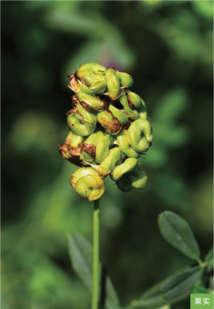 形态特征:多年生草本,高达60厘米。茎直立,丛生,上升、伏卧或斜上。叶互生;羽状三出复叶,小叶长卵形、倒长卵形至线状卵形,长7~16毫米,宽4~14毫米,边缘1/3以上具锯齿。短总状花序腋生,具花5~30朵;萼钟形,萼齿5枚;花冠淡黄色、深蓝色至暗紫色,稀苍白色。荚果熟时棕色,螺旋状卷曲2~4圈,中央无孔或近无孔,直径5~9毫米。种子黄色或棕色,卵形,长1~2.5毫米。花期5—7月,果期6—8月。