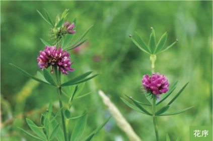 形态特征:多年生草本,高30~60厘米。茎直立,上部具分枝。叶互生;掌状复叶具小叶5枚,稀3枚或7~9枚;小叶片披针形至线状长圆形,长3~5厘米,宽5~16毫米,边缘具细锯齿,两面密布隆起的侧脉。头状花序着生于枝顶端和上部叶腋,具花20~35朵;花冠淡红色至红紫色。荚果棕灰色,长圆形,长约6毫米,宽约2.5毫米。种子橄榄绿色,宽卵形,直径1.5毫米,平滑。花果期6—10月。