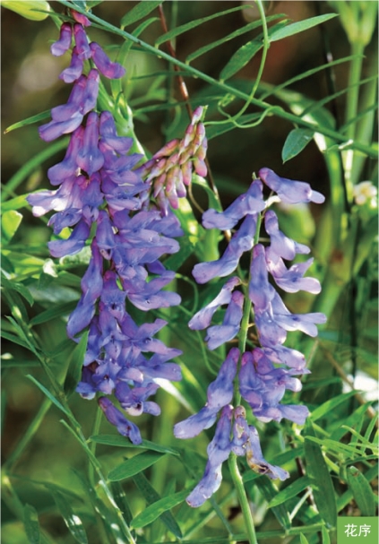 形态特征:多年生草本,高40~150厘米。茎攀援或蔓生。叶互生;叶轴顶端具分歧的卷须;偶数羽状复叶具小叶5~12对;小叶线形、长圆形或披针状线形,长1~3厘米,宽2~4毫米。总状花序腋生,花多数,密集;花萼钟状,萼齿5枚;花冠紫色、蓝紫色或紫红色。荚果长圆形或长圆状菱形,长2~2.5厘米,宽约0.5厘米,顶端有喙。种子黑褐色,扁圆球形,直径约2毫米。花期6—9月,果期9—10月。