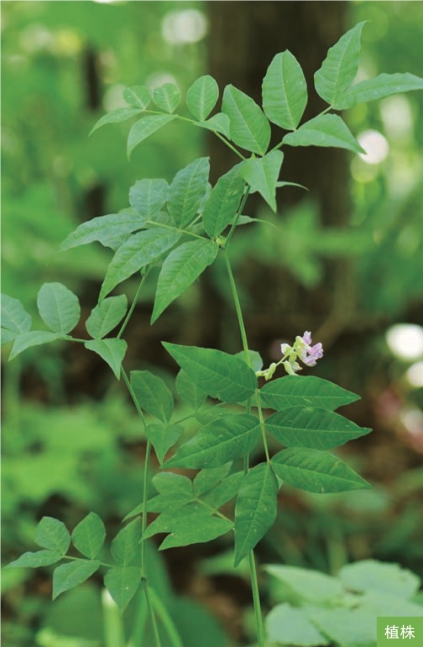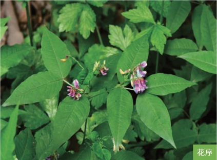 形态特征:多年生草本,高40~100厘米。根膨大呈块状,近木质。茎直立,具棱,常丛生。叶互生;叶轴顶端呈刺状;偶数羽状复叶具小叶2~4对;小叶片长卵圆形或长卵圆状披针形,长3~8厘米,宽1.5~3厘米,全缘。总状花序腋生,常于基部或总花序轴上部分支,呈复总状近圆锥花序;花萼斜钟状;花冠蓝色、蓝紫色至红紫色或玫瑰色,稀白色。荚果表皮黄色或干草色,长圆状菱形,长2.5~5厘米,宽5~7毫米。种子深褐色,椭圆形,直径约5毫米。花期6—8月,果期8—9月。