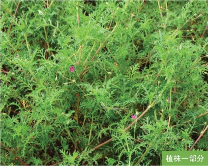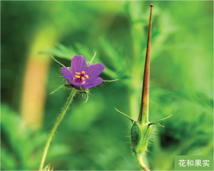 形态特征:多年生草本,高15~50厘米。根为直根。茎平铺或斜升,被柔毛。叶对生;叶片轮廓卵形或三角状卵形,长5~10厘米,宽3~5厘米,二回羽状深裂,小裂片线形,全缘或具疏齿。伞形花序腋生,每梗具2~5朵花;花梗花期直立,果期上部向上弯曲;萼片顶端具长芒;花瓣5枚,黑紫色。蒴果长约4厘米,密被短糙毛,顶端有长喙。种子褐色,具斑点。花期6—8月,果期8—9月。